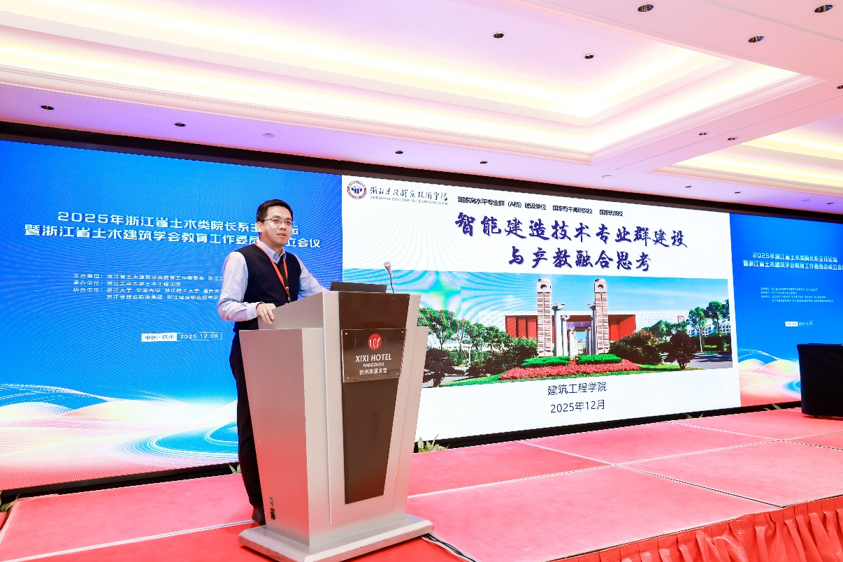 6场报告。我校建筑工程学院马行耀副院长做了题为“智能建造技术专业群建设与产教融合思考”的专题报告,分析了我省智能建造技术专业群建设的需求与可行性,介绍了专业群的建设目标,阐述了以数字化赋能建筑产业新质生产力发展为核心驱动、构建”四位一体”具有浙江辨识度的智能建造技术专业群建设方案。