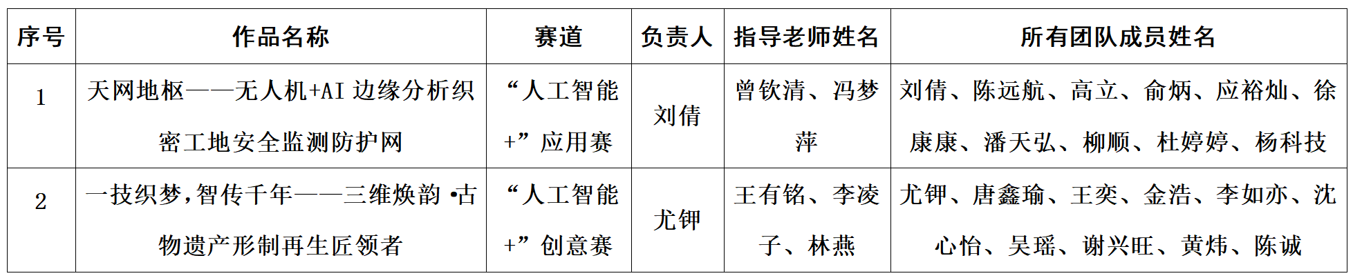 第十九届“挑战杯”全国大学生课外学术科技作品竞赛“人工智能+”专项赛自启动以来,经二级学院自主申报,校外专家评委评审,省级竞赛组委会审核推报,拟推荐《天网地枢——AI+无人机边缘分析织密工地安全监测防护网》等2个项目参加国赛,现予以公示。