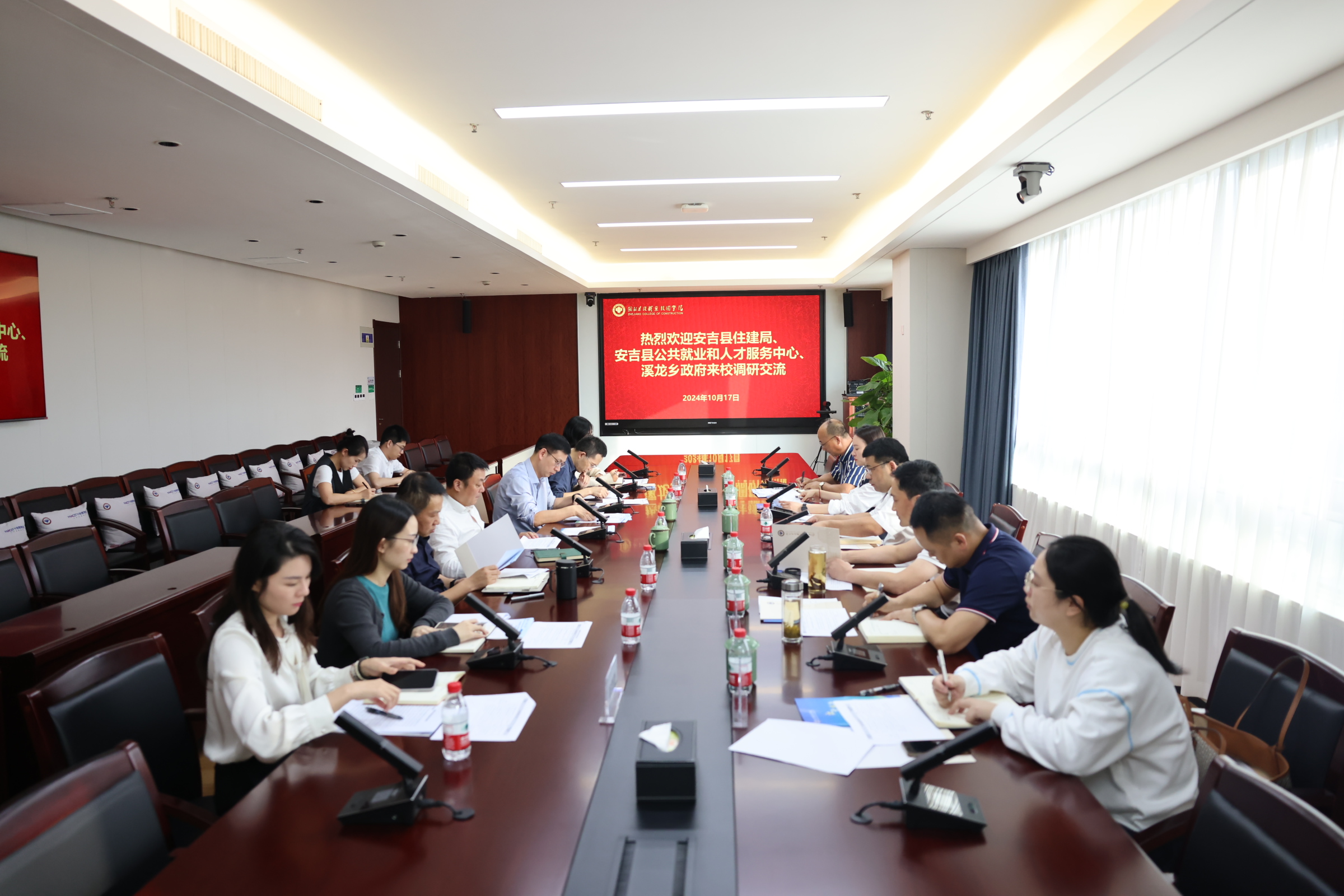 10月17日,安吉县住建局、公共就业和人才服务中心以及溪龙乡政府一行莅临我校,进行深入调研与交流。学校党委书记何青峰,党委委员、组织部部长林振袍,以及学校办公室、产学研合作处、招就处、继续教育学院及校团委负责人参与了座谈交流。