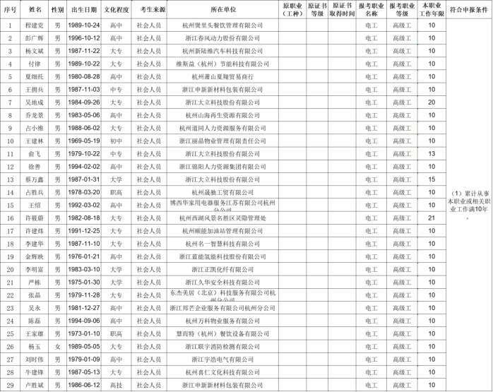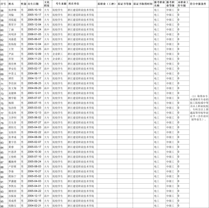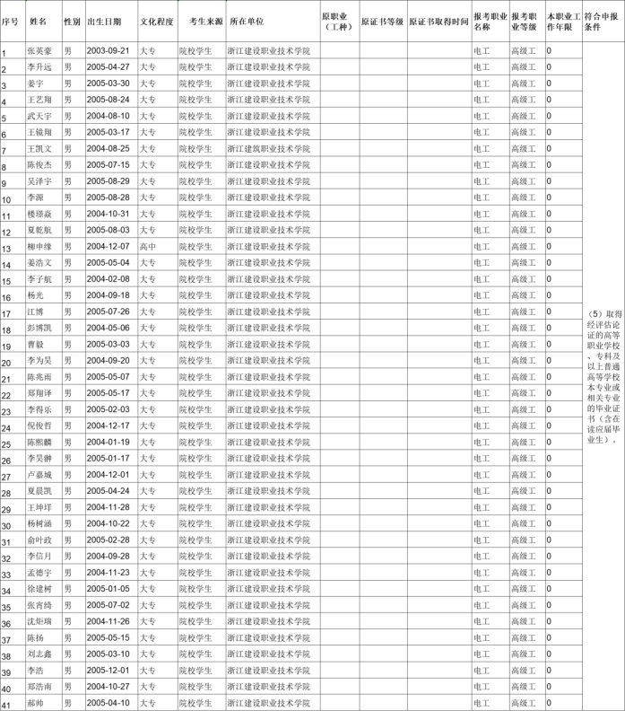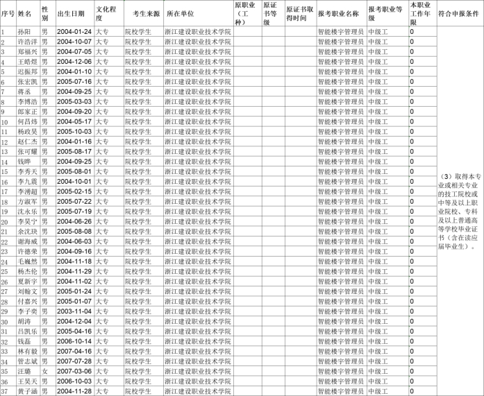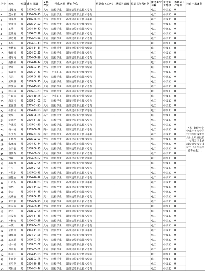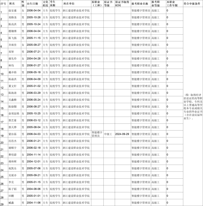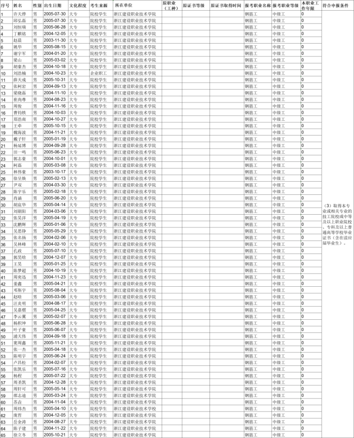 现将2025年10月25日电工(四级)、智能楼宇管理员(三级)、智能楼宇管理员(四级)、钢筋工(四级)以及26日电工(三级)职业技能等级认定考生报名结果信息予以公示,公示时间为5个工作日(2025年10月20日——2025年10月24日)。