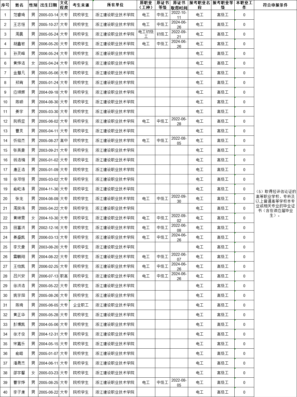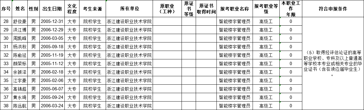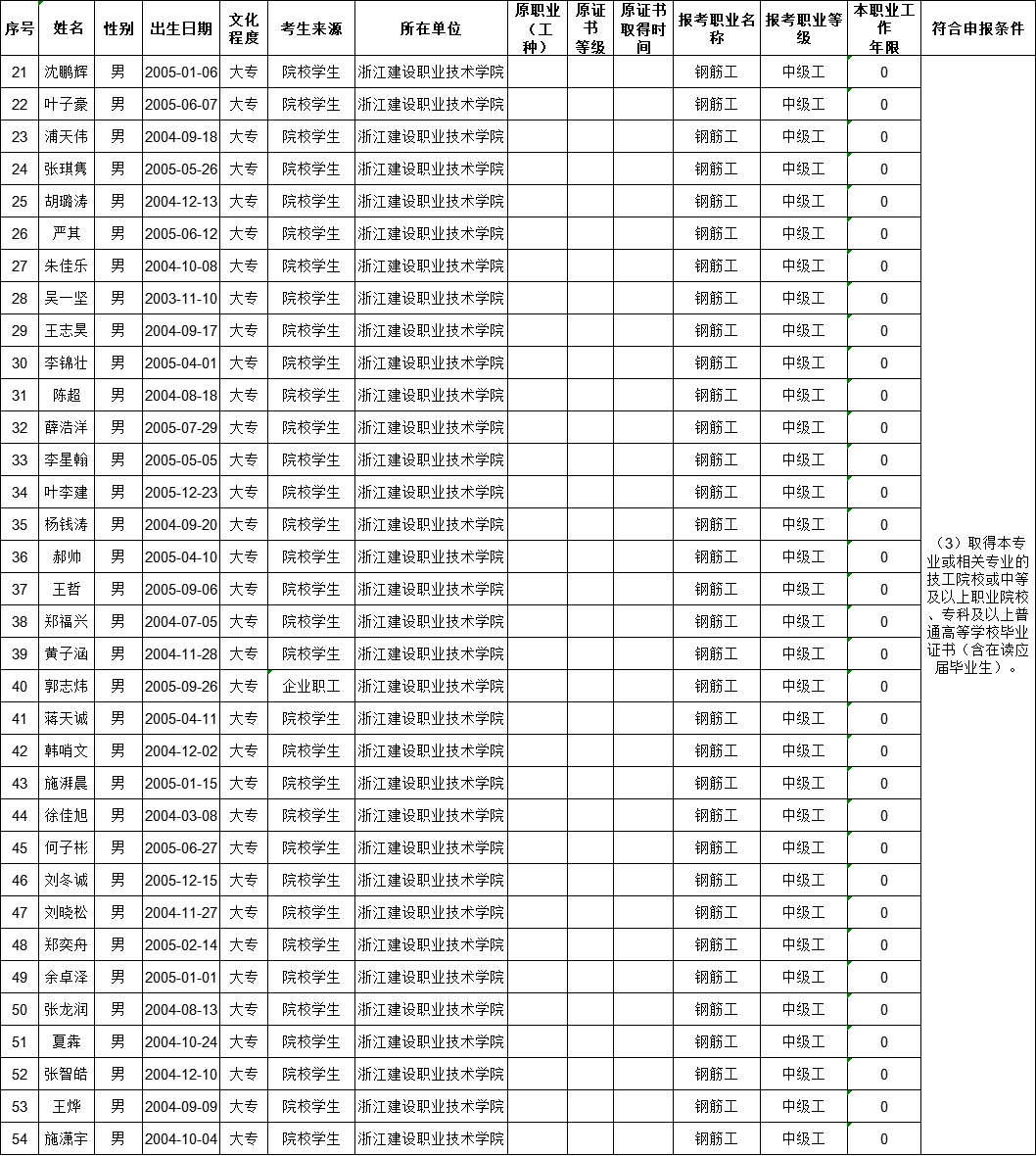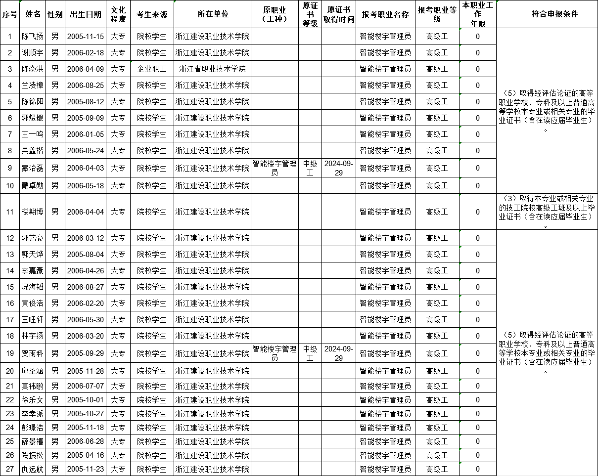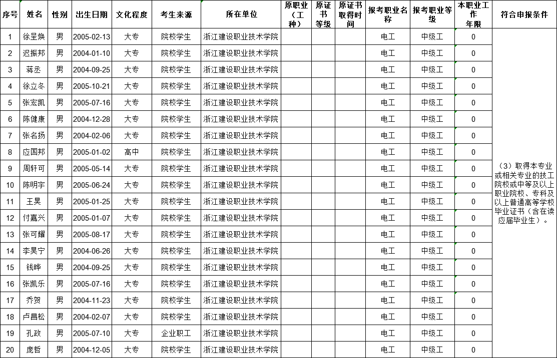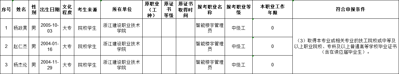 现将2025年11月22日电工(四级)、电工(三级)、智能楼宇管理员(三级)、智能楼宇管理员(四级)、钢筋工(四级)职业技能等级认定考生报名结果信息予以公示,公示时间为5个工作日(2025年11月13日——2025年11月19日)。