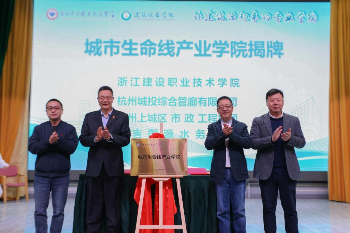 为共同建好城市生命线产业学院,学校副校长陈东平代表浙江建设职业技术学院分别与杭州城投综合管廊有限公司党支部书记、副总经理沈炯,安吉国源水务集团党总支书记、执行董事、总经理钱炯,杭州上城区市政工程集团有限公司副总经理杜昕签署了战略合作协议,并正式为“城市生命线产业学院”揭牌。