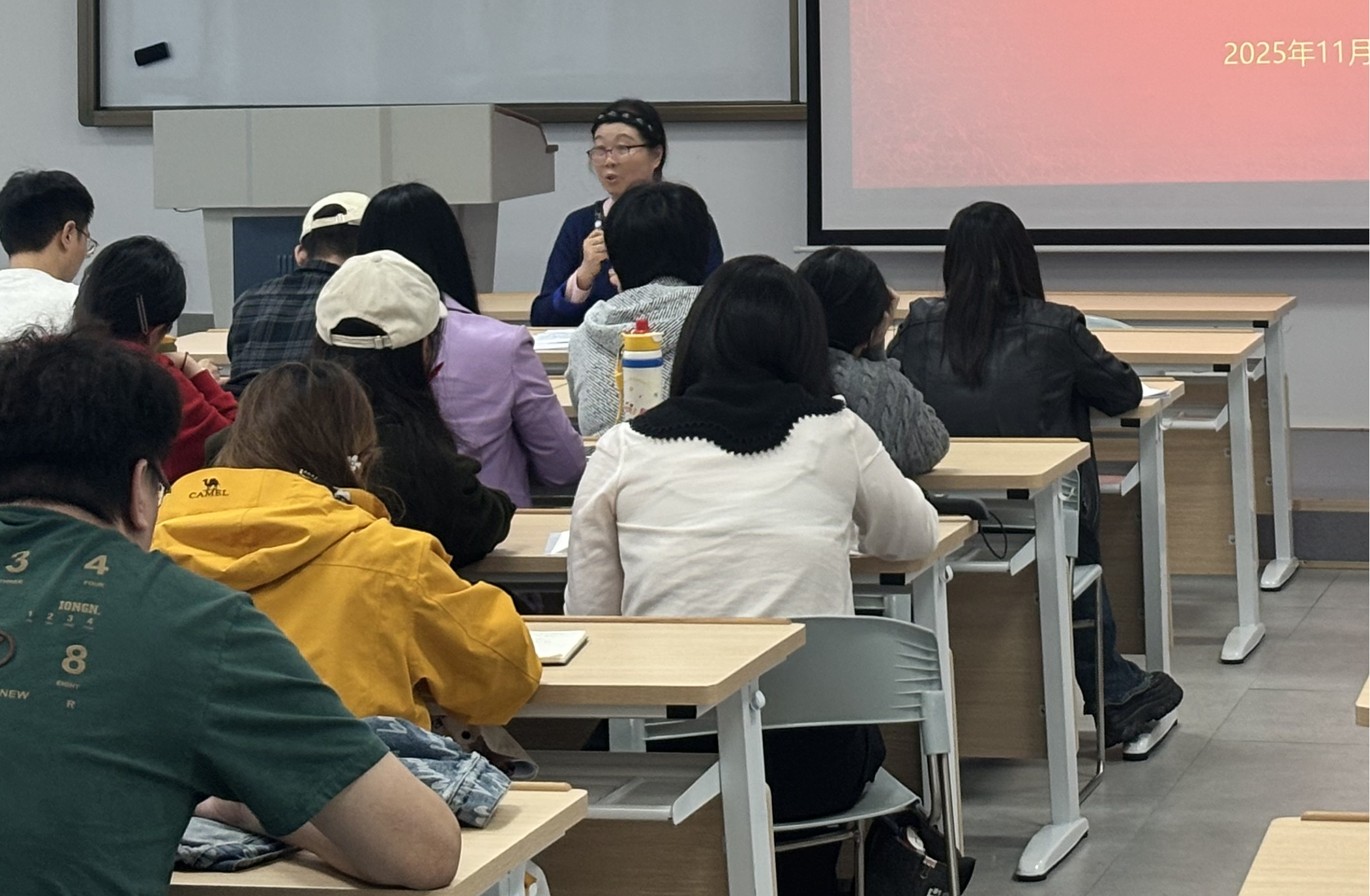 点评环节结束后,胡丹鸯老师作主题讲座。她认为历史伟力是思政课教师“立德树人”工作的鲜活素材和底气来源。仅凭空洞的说教或纯知识性的讲述往往是苍白无力的,历史进程中的鲜活人物、动人故事、崇高精神,才是“立德树人”理想信念教育的鲜活教材。她强调要提升思政课教师的“历史感”、“信仰度”、理论功底和情感认同,要做到真学、真研、真信、真悟、真讲,在教学实践中不断学、思、行、悟,不断深化对历史的理解,不断提升理论功底。